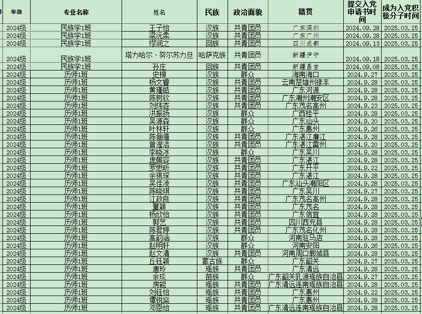 民族学院2024级孙庄等36位学生已于2024年9月-10月期间向党组织递交入党申请书,根据团支部推优结果、党员推荐结果和党支部考察意见,拟确定孙庄等36位学生为入党积极分子。按照发展党员的相关规定,现予以公示。党员和群众如有意见或建议,可采用口头或书面形式于2025年3月23日前向民族学院党委或学校党委组织部反映。