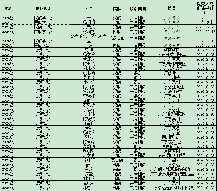根据入党自愿原则,孙庄等37名同学已经向学院直属党支部提交了入党申请书。按照发展党员工作程序,现予以公示,本公示限期5天,若有不同意见的,请在公示期内可采口头或书面形式于10月21日前向民族学院党委或学校党委组织部反映。反映情况时要自报或签署真实姓名,要有具体事实,不签署真实姓名或不提供具体事实材料的,一律不予受理。
